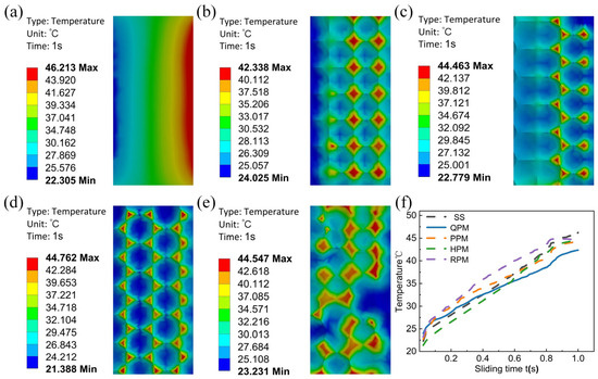 Temperature contour evolution curves of different bionic functional surfaces with sliding time. (a) Smooth surface temperature cloud map; (b) Surface temperature cloud map of quadrilateral pit morphology; (c) Surface temperature cloud map of pentagonal pit morphology; (d) Hexagonal pit morphology surface temperature cloud map; (e) Random distribution of pit morphology surface temperature cloud map; (f) The curve of temperature variation over time for different biomimetic surfaces, SS (Smooth Surface), QPM (Quadrilateral Pit Morphology), PPM (Pentagonal Pit Morphology), HPM (Hexagonal Pit Morphology), and RPM (Random Pit Morphology).
