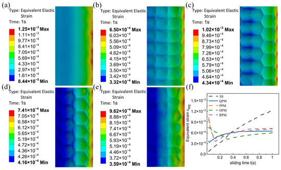 Equivalent elastic strain contour maps and evolution curves with sliding time for different bionic functional surfaces. (a) Smooth surface equivalent effect cloud map; (b) Surface equivalent effect variation cloud map of quadrilateral concave pit morphology; (c) Surface contour map of pentagonal concave pits with equivalent effects; (d) Hexagonal concave pit morphology surface equivalent effect variation cloud map; (e) Random distribution of pit morphology and surface equivalent effect variation cloud map; (f) Time dependent curves of equivalent effects on different biomimetic surfaces, SS (Smooth Surface), QPM (Quadrilateral Pit Morphology), PPM (Pentagonal Pit Morphology), HPM (Hexagonal Pit Morphology), and RPM (Random Pit Morphology).