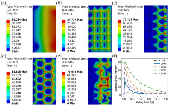 Frictional stress contour maps and evolution curves with sliding time for different bionic functional surfaces. (a) Smooth surface friction stress cloud map; (b) Surface friction stress cloud map of quadrilateral concave pit morphology; (c) Surface friction stress cloud map of pentagonal concave pit morphology; (d) Hexagonal pit morphology surface friction stress cloud map; (e) Random distribution of pit morphology surface friction stress cloud map; (f) Curve plots of frictional stress over time on different biomimetic surfaces, SS (Smooth Surface), QPM (Quadrilateral Pit Morphology), PPM (Pentagonal Pit Morphology), HPM (Hexagonal Pit Morphology), and RPM (Random Pit Morphology).
