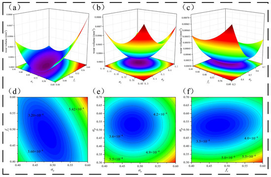 Response surface diagram of the interaction between various factors on the impact of wear volume. (a,d) Radial spacing ae and feed per tooth fz; (b,e) Radial spacing ae and axial depth of cut ap; (c,f) Feed per tooth fz and axial depth of cut ap.
