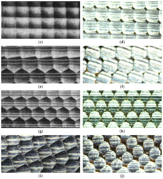 Comparison of surface morphologies before and after wear for different bionic surface structures. (a) Smooth surface before wear. (b) Smooth surface after wear. (c) Quadrilateral dimples before wear. (d) Quadrilateral dimples after wear. (e) Pentagonal dimples before wear. (f) Pentagonal dimples after wear. (g) Hexagonal dimples before wear. (h) Hexagonal dimples after wear. (i) Random dimples before wear. (j) Random dimples after wear.