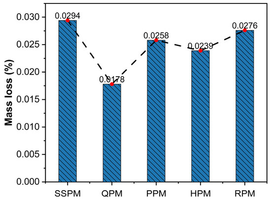 Figure 15 shows the comparison of mass loss rates of samples with different surface morphologies in wear experiments. As shown in the figure, the smooth surface sample has the highest mass loss rate, indicating that its wear resistance is the worst during the friction process. In contrast, surfaces with regular quadrilateral pits exhibit the best wear resistance, with the lowest mass loss rate. Other surfaces with pit structures, such as pentagonal pits, hexagonal pits, and randomly distributed pits, show better wear resistance than smooth surfaces. This indicates that appropriately designed biomimetic pit textures can effectively reduce material wear during friction and improve surface wear resistance. In summary, surface structures with regular geometric shapes have significant advantages in reducing mass loss, among which the quadrilateral pit structure has the best drag reduction and wear resistance effect.