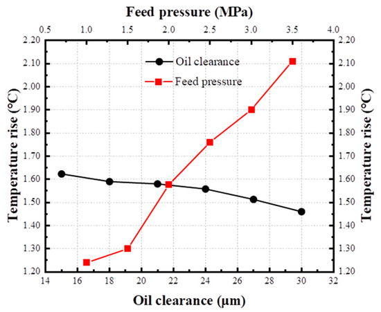 - The temperature rise in the hydrostatic turntable system increases with the increase in the oil supply pressure and decreases with the increase in the oil film clearance. The oil supply pressure has a greater influence on the temperature rise and thermal deformation than the oil film clearance. This conclusion is helpful for the coordinated control of the oil supply pressure and the oil film gap of the hydrostatic turntable. The flow rate can be increased by moderately increasing the oil film gap and the oil supply pressure, thereby reducing the heat generated by the oil film surface during the movement, causing a large amount of heat to be taken away by the hydrostatic oil, so as to reduce the temperature rise in the hydrostatic turntable system and improve the overall accuracy.