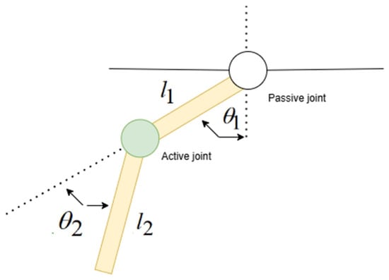 and represent the masses of the first (shoulder) and second (elbow) links, respectively. These masses influence the inertial properties of the links and play a significant role in determining the system’s kinetic energy and dynamic response to external forces. The unit is kg; in this paper, both are 1 kg.