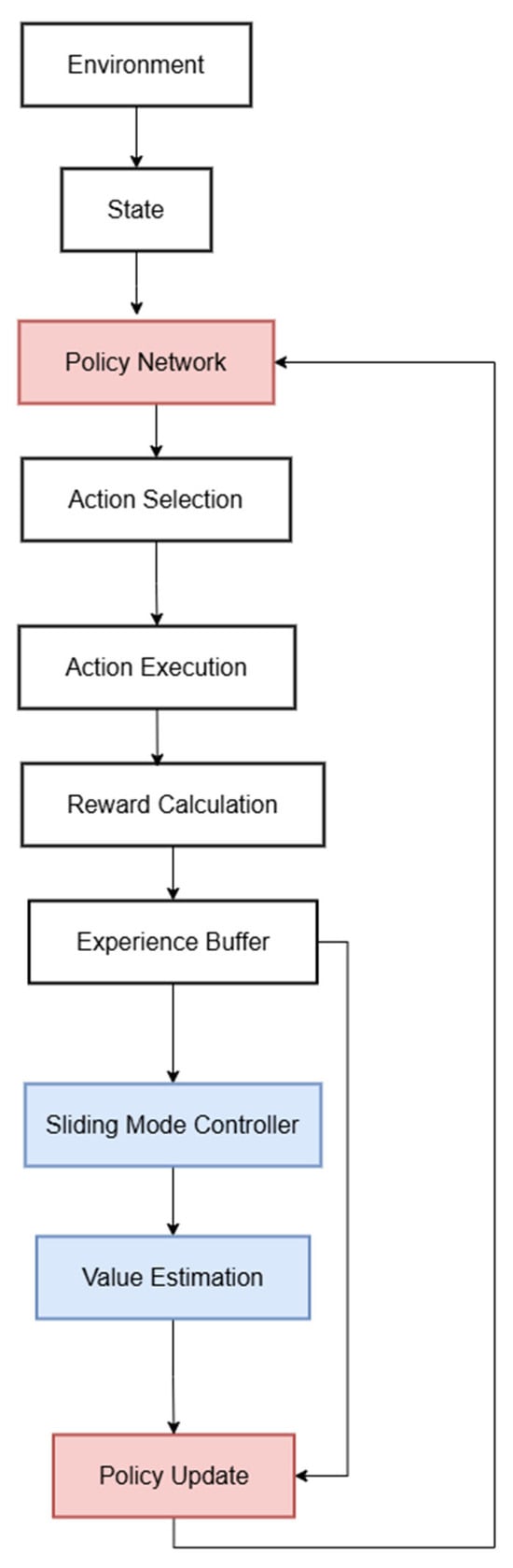 Figure 3.The design concept diagram illustrates the two-stage architecture of the hybrid control framework. The diagram highlights the sequential integration of PPO and SMC: Stage 1 (PPO for Swing-Up):The reinforcement learning agent learns to generate control torque that swings the Acrobot from the hanging state to a near-vertical state. Stage 2 (SMC for Stabilization):Upon meeting the verticality criterion (Equation (14)), the controller switches to SMC. The sliding mode controller processes tracking errors and their derivatives to compute a robust control input that stabilizes the system at the equilibrium point.