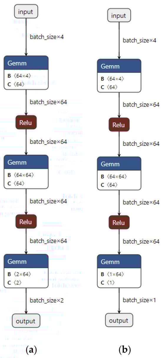 Figure 4a): Input Layer: Receives the input state vectors. Hidden Layers: Two fully connected layers with 64 neurons each or 128 neurons, using ReLU activation functions to capture nonlinear dynamics. Output Layer: For discrete action spaces, the layer produces logits for a categorical distribution; for continuous spaces, it outputs the mean and standard deviation of a Gaussian policy (Equation (17)).Value Network (