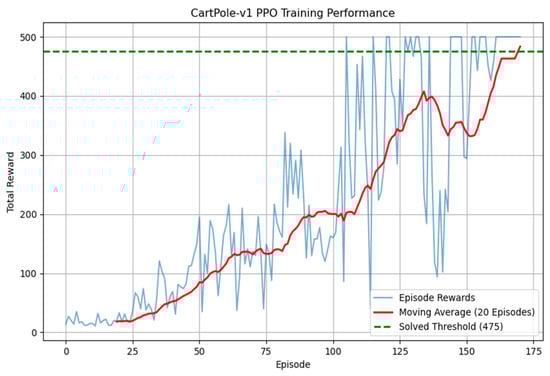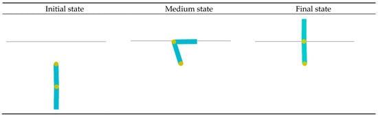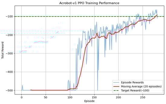 Figure 7 illustrates the cumulative reward trajectory during training for the Acrobot system. The agent starts with a random policy, yielding a baseline reward of −500 (Episode 0), indicating complete failure to stabilize. By Episode 500, the reward improves to −100, reflecting a significant reduction in penalty steps and successful learning of swing-up motions. This improvement highlights the effectiveness of the proposed hybrid PPO–SMC framework in overcoming the underactuated system’s challenges. The training process is shown in