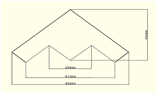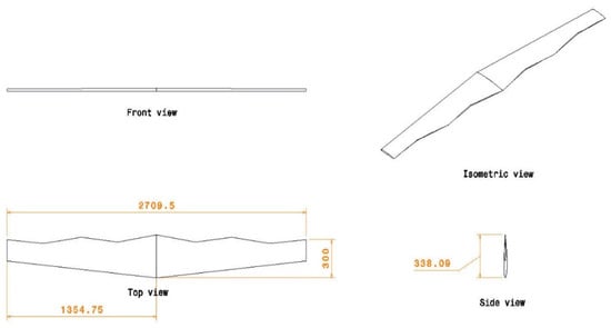The sweep angle of the flying wing of this UAV is revealed in Equation (7), which comprises of root chord of the flying wing, tip chord of the flying wing and half of the wingspan [28,29].