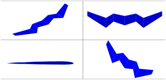 The sweep angle of the flying wing of this UAV is revealed in Equation (7), which comprises the root chord and tip chord of the flying wing along with half of the wingspan. Here, the angle changes after 60% of the span.