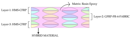 The structural analysis results showed the superior working of the NIP-3 model when taking the deformation parameter into consideration. However, it cannot be the only deciding factor as there are other parameters involved in the study. In order to improve the performance of the material when imposed over NIP-3, which is the best working configuration, a hybrid material is designed that involves the combination of the best and worst performing materials. HMS-CFRP and GFRP-FR-4-FABRIC are the two chosen materials for the hybrid material design process. The layers of the two materials are aligned and solved for the creation of a new hybrid material, as shown in Figure 77.