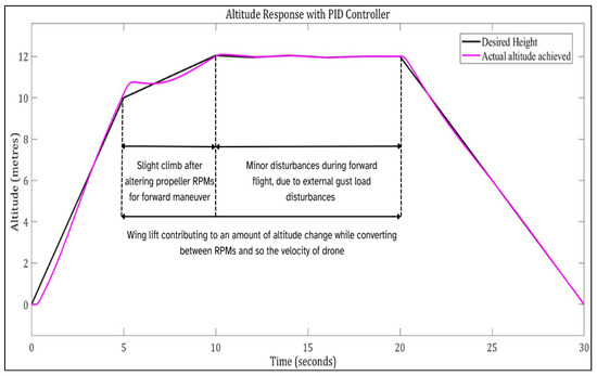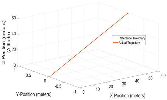 From Figure 83, it is observable that the other components of the drone, contributing to its overall weight and its following design calculations, are input onto the MATLAB R2024b software. From its estimated propeller thrust and RPM related data to be used for maneuvering purposes, it is calculated by the control block integrated with the PID controller, tuned for a stable enough response. From the result of the analysis, Figure 84 shows a takeoff maneuver in which the X-direction, which is range or length through runway, and Z-direction, namely, the altitude is increasing simultaneously as seen for a flying wing UAV. The tuned responses of gain values show a convenient takeoff response without much overshoot that follows the reference trajectory provided as an input. Figure 85 demonstrates the change in altitude between the given height and achieved actual height in the z-axis due to the gain variation and tuning process of PID controller. Also, the lift generated due to presence of wing is shown to be producing minor amount of forces, as seen in the simulation response.