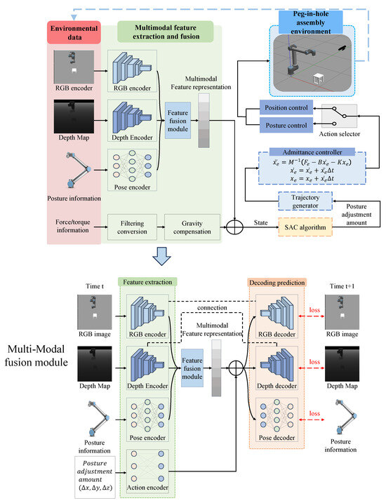 - We develop a multimodal feature fusion network based on the convolutional autoencoder; this network can effectively extract and fuse multimodal information (RGB image, depth map, force–torque signals, robot pose information). The fused features provide rich context for decision-making during assembly tasks.