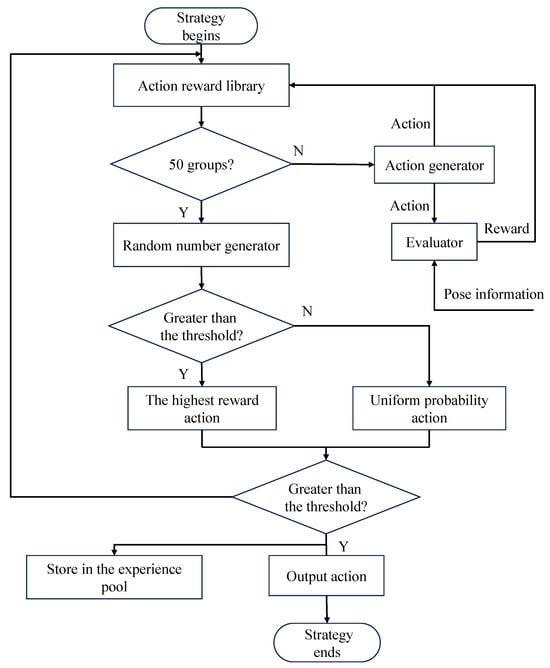The random number threshold set in this paper is 0.65. The higher the threshold, the stronger the randomness of the system’s exploration of the environment. Furthermore, in this paper, the concept of experience pool is introduced during the exploration process to record each executed action and the position reached after the execution of the action. To a certain extent, it can avoid repetitive selective exploration of the same position and action, thereby improving the exploration efficiency of the system in the environment. Based on the proposed random exploration strategy, the system can explore the environment or workspace to the greatest extent, collect sufficient and rich multimodal data samples, and ensure the acquisition of a certain number of high-reward actions, thereby improving the stability and generalization ability of the multimodal network. The random exploration strategy designed in this paper is shown in Figure 2.