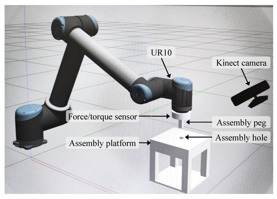 (2) Sensor Configuration: The ROS-Industrial Universal Robot function package is a robot description file built for the Gazebo platform, containing basic information of the robot and rich perception options, such as joint angle state, speed state, acceleration state, joint force state, etc. Furthermore, the Gazebo platform provides a wide range of sensor API interfaces. In this paper, visual sensors and six-dimensional force/torque sensors are adopted to implement various modal environmental perception methods. The visual sensor part publishes the original RGB information and depth map information with a resolution of 640 × 480 at a frequency of 30 Hz, providing visual guidance and feedback information for robot operation. The force/torque sensor is installed between the center of the robot flange and the assembly peg, and it releases the contact force and torque between the robot and the environment at a frequency of 1000 Hz, providing force feedback information for the robot operation.