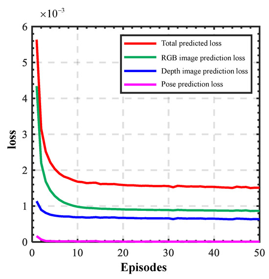 The test result of the multimodal fusion network based on the deterministic model is given as the prediction loss curve shown in Figure 5, which includes four loss situations: total prediction loss, RGB prediction loss, depth prediction loss, and pose prediction loss. Among them, the total prediction loss is the sum of the other losses. It can be observed that with the increase in the number of training sessions, all the losses of the network monotonically decrease, and convergence is achieved in the 10th episode. The loss values after network convergence are stable as shown in Table 1. The total prediction loss is the RGB prediction loss is , the depth prediction loss is , and the pose prediction loss is . The test results prove the effectiveness of the multimodal fusion network based on the deterministic model.