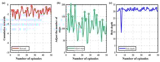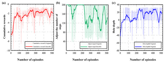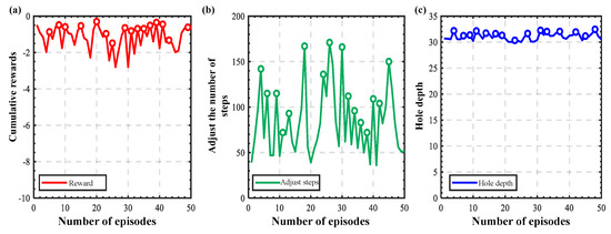 Learning process of peg-in-hole assembly skills based on deterministic model: (a) Cumulative reward per episode; (b) Number of adjustment steps; (c) Insertion depth during training.