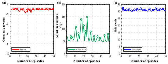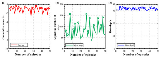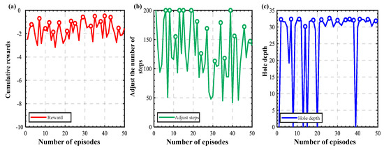 The generalization experimental results of the square peg-in-hole strategy applied to the hexagonal peg-in-hole assembly scenario are shown in Figure 12. It can be seen that the cumulative reward can still remain stable within a range. Moreover, in this experiment, all the assembly tasks in all episodes were inserted into the holes. Among them, the assembly tasks were successfully completed in 49 episodes, and 14 mm was inserted into the hole in 1 episode (the adjustment steps exceeded the limit). The success rate was 98%.