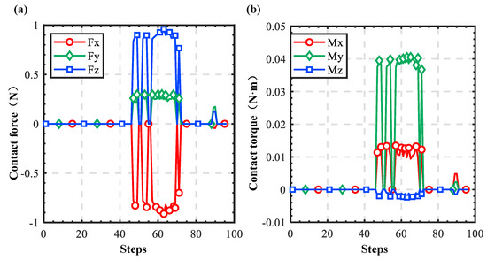 Contact force and torque conditions during peg-in-hole assembly: (a) Contact force over steps; (b) Contact torque over steps.