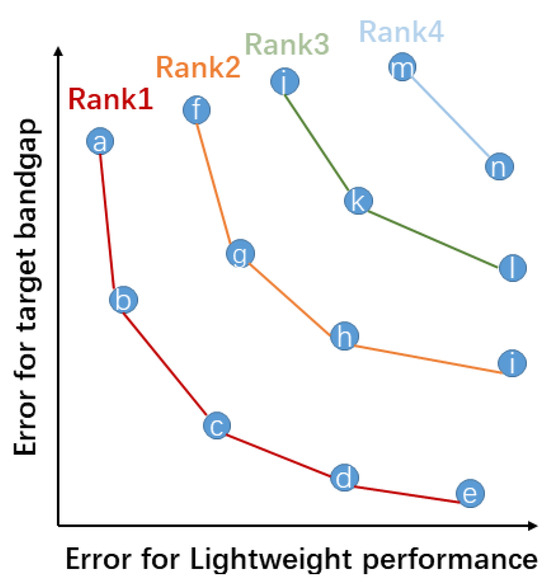 The principles of dominance and ranking are illustrated in Figure 2. For data point , if its objective values—the band gap error and structural quality—are lower than those of data point , then dominates over . This relationship is exemplified in Figure 2, where data point c dominates over data point g. Subsequently, individuals not dominated by any others are classified as the first Pareto front (Rank 1), as depicted in Figure 2. The next set of individuals, who are only dominated by those in Rank 1, form the second Pareto front (Rank 2), and so on [19,25]. Following this sorting principle, a finite element analysis is employed to evaluate the properties of all parameter combinations. The results are then organized into their respective Pareto fronts, as shown in Figure 2 [26].