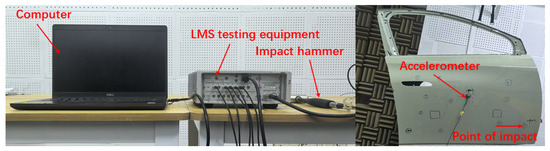To validate the performance of the optimized local resonance unit for low-frequency vibration suppression in automobile doors, we constructed the experimental setup shown in Figure 5. The car door under test was suspended using elastic cords to emulate the free–boundary conditions of the numerical model. A modal hammer was used to provide impact excitation, and tri-axial accelerometers were installed at designated measurement points to capture vibration acceleration signals. The acquired data were subsequently analyzed and processed using LMS Test.Lab.