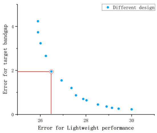 This method sets two optimization objectives: objective 1 is to minimize the band gap error, defined by Equation (1), where is the return value of the fitness function for the first objective. The smaller the fitness function value, the closer the first-order band gap of the local resonance unit is to the target. Here, M is the maximum frequency of the first dispersion curve, and m is the minimum frequency of the second dispersion curve. The smaller the fitness function value, the closer the first-order band gap of the local resonance unit is to Hz − Hz.