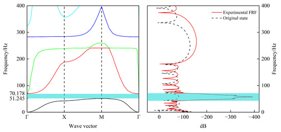 First, the vibration attenuation performance of the designed LRAM was evaluated via simulations. In COMSOL Multiphysics, both the dispersion relations and the transfer function of the structure were computed, as shown in Figure 9. The first-order band gap was found to range from to , demonstrating excellent vibration suppression capabilities within the 50–70 Hz band.
