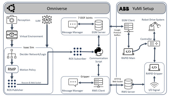 To facilitate communication between the DT in the virtual environment and the physical YuMi robot, the framework employs the same communication setup as detailed in our previous work [11]. The Joint Control node in Isaac Sim continuously publishes joint states, including joint positions, velocities, and effort, to the ROS server, which are then streamed to the robot controller using Google Protocol Buffers for efficient data serialization.