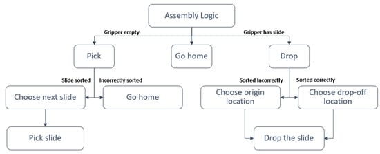 When the simulation begins, the control flow follows the sequence defined in the decider network, starting with a check of the gripper’s status. The gripper has two possible states: “has slide” or “empty.” For example, if the gripper is empty, the next logical step is to initiate a pick operation. Before selecting a slide to pick, the system verifies if the currently sorted slides are in the correct order. If the order is correct, a new slide is selected, and the pick operation is performed. The position and orientation of the selected slide are retrieved from the virtual environment to execute the pick action accurately. Once the pick operation is completed, the process thread is finished. Once the slide is picked up, a similar approach is used to drop it off at a desired location. After completing the drop-off sequence, the system checks if there are any remaining slides to pick. If no more slides are left, a “go home” sequence is executed, guiding the robot arm back to its home position.