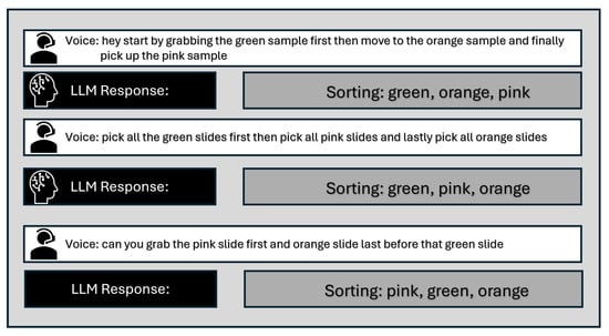 The integration of LLMs into robotic systems is demonstrated by their ability to interpret verbal instructions for performing dynamic sorting tasks, as shown in Figure 5. In this scenario, an operator provides commands specifying the desired sorting order of color-coded slides (e.g., “pink, orange, green”). The LLM interprets these inputs and translates them into actionable instructions, such as “Sorting: pink, orange, green.” This highlights the LLM’s capacity to comprehend and adapt to variations in human input, allowing for reorganization based on different operator preferences. After the LLM generates the task sequence, the sorting order, illustrated in Figure 5, is passed to the decider network, which executes the necessary logical steps for the robot’s task sequence. As the robot performs the slide sorting operation based on the task sequence generated, the real-time joint data from the digital simulation are transmitted to the physical robot.