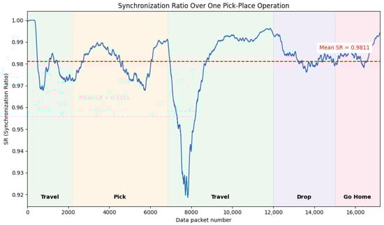 These values are used to compute the Synchronization Rate (), as defined in Equation (1) by Z. Wang, Y. OuYang et al. [54], where represents the joint values from the Isaac Sim model and represents feedback from the physical robot. The current setup achieves an overall synchronization rate of 98.11% showing correct data transmission and good synchronization of the physical robot to the virtual robot. The calculated for each data packet sent to EGM is evaluated for one pick-place sequence, as shown in Figure 6. The plot illustrates varying across different stages of the task, with the most significant deviations occurring during the travel sequence from pick to drop. This is primarily attributed to two factors: (1) the computational load from physics-based collision calculations (gripper and slide) in the simulation, which delays joint data publishing to the ROS node, and (2) changes in the direction of joint motion, which introduce increased intervals in the joint value.