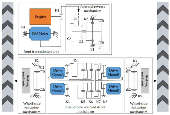 - Li, R.; Fan, J.; Han, Z.; Guan, S.; Qin, Z. Configuration design and control of hybrid tracked vehicle with three planetary gear sets. J. Cent. South Univ. 2021, 28, 2105–2119. [Google Scholar] [CrossRef]
