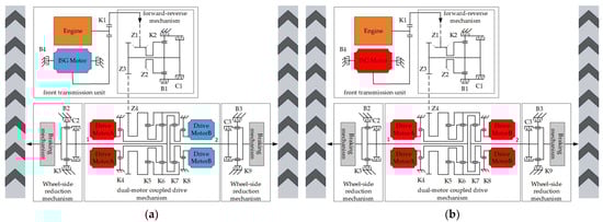 - When an electric drive system fault occurs, the engine drives the tracked vehicle independently. The load is controlled via the B4 clutch and mechanical steering can be achieved by leveraging the brake pressure difference.