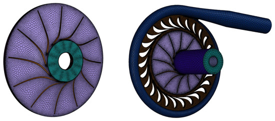 The boundary conditions for the rotor analysis were established as follows: a fixed support constraint was applied at the hub base to simulate the connection with the shaft, while a rotational velocity of 3000 rpm was imposed on the entire structural domain, accounting for the Earth’s gravitational field (9.81 m/s2). Additionally, pressure loads obtained from a CFD analysis of the fluid domain were mapped onto the blade surfaces to capture fluid–structure interaction effects.