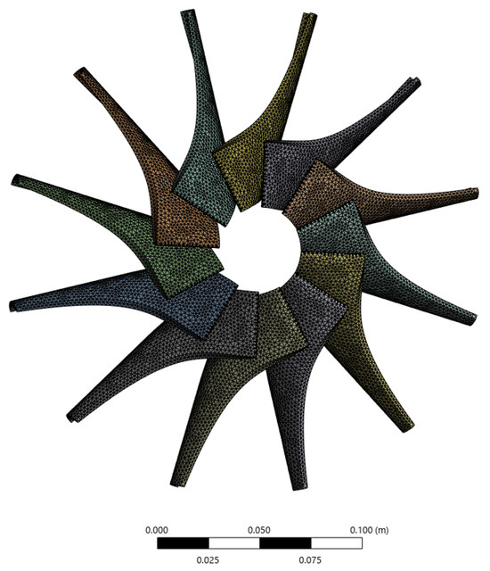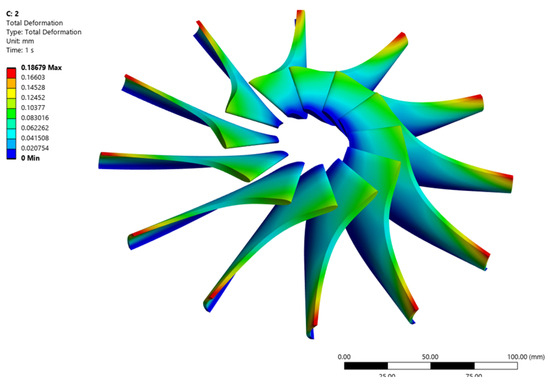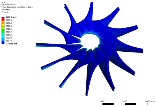 The process for analyzing the rotor without considering the coupling of the fluid–structure interaction is simple. First, the pressure distribution on the blade surface was solved within the fluid domain using computational fluid dynamics. Next, the corresponding pressure loads were applied to the blade structure model (see the finite element model for turbine blades in Figure 2) to determine the resulting stresses and strains of the blade structure. Finally, the von Mises stress results of the rotor blade structure calculated by using ANSYS ANSYS2024 R2 are shown in Figure 3.