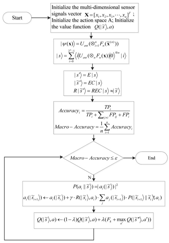 In practical engineering, the quantum Q-learning fault diagnosis system operates through the continuous iterative mechanism of error correction, action selection, and policy update specified by the above formula. This mechanism enables the system to steadily enhance fault diagnosis accuracy, thereby ensuring the stable operation of intelligent manufacturing equipment. The reward function serves as the core component of fault diagnosis decision-making in the quantum learning mechanism. As a critical feedback signal in the intelligent behavior decision-making process, it effectively guides the agent to learn the optimal fault diagnosis strategy. The flowchart of the quantum Q-learning fault diagnosis algorithm is illustrated in Figure 1: