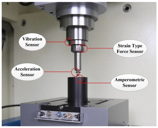 As can be observed from Figure 3, the strain-type force sensor mounted on the tool handle is capable of precisely measuring the dynamic changes in the cutting force. By analyzing the amplitude and frequency characteristics of the cutting-force signal, it can effectively identify the wear state of the tool. The acceleration sensor positioned at the front of the spindle can monitor the vibration signal. In combination with spectrum analysis technology, it can be used to judge whether there are fatigue cracks or poor lubrication issues in the bearing. The current sensor of the servo motor can promptly detect fluctuations in the armature current, enabling the timely identification of electrical faults such as motor overload or winding short circuits. The accuracy indices of each sensor are presented in Table 2.