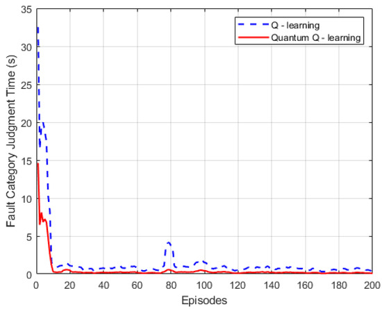 It can be discerned from Figure 5 that, at the commencement of training, the fault judgment time of the traditional Q-learning algorithm exhibits significant fluctuations across different training rounds. This implies that its discrimination of fault types is insufficiently accurate during that initial phase. Although the curve of fault identification demonstrates a downward trend in this stage, the judgment time remains high in certain rounds, peaking at around 20 s or even exceeding that, suggesting that its response in judging fault types is not prompt enough.