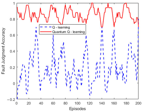 Conversely, the fault type recognition curve of quantum Q-learning displays a downward trend right from the start of training, and the rate of decline is rapid. It plummets from nearly 15 s, which indicates that the quantum Q-learning algorithm is more attuned to fault occurrences and stabilizes more swiftly than the traditional Q-learning algorithm. In the majority of training rounds, the fault category recognition time of the quantum Q-learning algorithm is shorter than that of the traditional Q-learning algorithm, further attesting to the quantum Q-learning’s certain edge in terms of fault category judgment time. The accuracy of its fault judgment is illustrated in Figure 6.