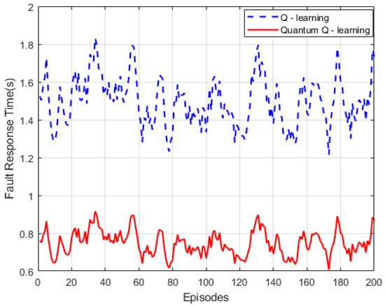 As shown in Figure 7, the fault response time curve of the traditional Q-learning algorithm fluctuates more frequently during the training process. The fault response time is unstable, and it is relatively long within the interval [1.2, 1.8]. In contrast, the fault response time curve of the quantum Q-learning algorithm remains relatively stable across different training rounds. The fault response time is generally maintained at a lower level, ranging approximately from 0.6 to 0.8. This indicates that the quantum Q-learning algorithm can respond to faults more promptly and has distinct advantages in fault response. Although there are minor fluctuations, the overall range of change is relatively small.