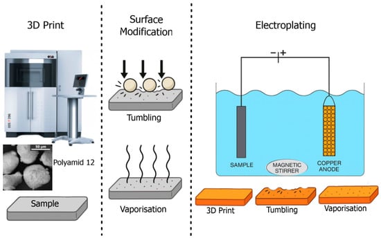 To achieve optimal properties of the plated surface, surface modifications by tumbling and vaporisation were tested. Tumbling is a mechanical process in which abrasive media remove surface irregularities and simultaneously reduce surface roughness. It results in a unified, textured surface with better conditions for adhesion of the electroplated metal. Vaporisation is a chemical–physical process in which the surface of the material treated by steam is provided with solvent vapor or other substances. This method enables a smoother and more homogeneous surface to be achieved, which can impact the uniformity of the subsequent plating. According to recent publications, surface preparation is one of the main factors affecting the quality and integrity of the Cu coating [24,25]. The overall results indicate the use of pretreatment in the subsequent use of 3D-printed products, with an emphasis on the time and cost of the production process.