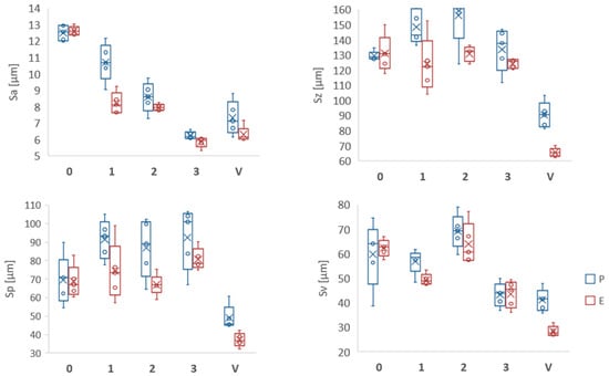 The Sa value decreases significantly from State 0 to State 3, where it reaches its lowest values for P3 = 6.2 ± 0.2 µm and E3 = 5.8 ± 0.3 µm. Post-processing significantly reduces surface roughness. However, when comparing the Sa parameter values for the P and E sets (Table 1), the results showed that the largest decrease in Sa parameter values occurred in E1 (by 23.4%), where the Sa values for P1 and E1 were 10.7 ± 1.0 µm and 8.2 ± 0.6 µm, respectively.