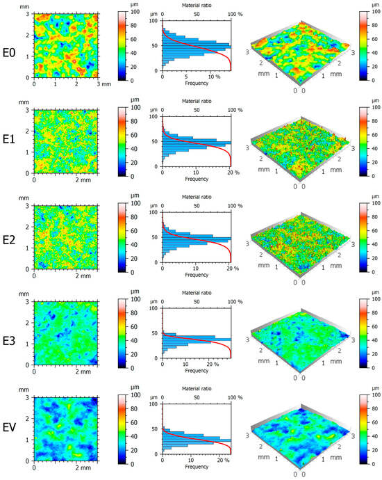 It is observed that surfaces E0, E1, and E2 achieve similar height values. The same is true for surfaces E3 and EV, which have a similar height range. The 2D maps show significantly different distributions of density and size of the surface elements. The Abbott–Firestone curves and histograms show the cumulative representations of heights and provide information about the bearing surface. The material ratio indicates improved bearing capacity and surface contact area, which is important for applications such as seals, sliding parts, or decorative layers. Samples E1 and E2 also have a similar course. The same is true for samples E3 and EV. The change is significant between E0 and E1/E2 and then between E3/EV. The histograms gradually narrow, and a difference in the smaller dispersion of heights is observed. The 3D models of surface topography visualise height differences, their distribution, and size. Samples E1 and E2 have a more pronounced texture compared to E0, E3, and EV. At the same time, E3 and EV have a smoother and more homogenised surface.