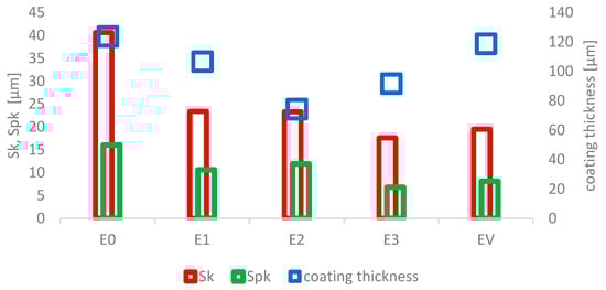 Comparison of functional areal roughness parameters Sk, Spk, and coating thickness.