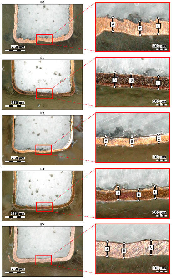 Figure 6 visualises the thickness and quality of the copper coating. The samples are labelled E0, E1, E2, E3, and EV, each with enlarged detail of the interface between the substrate and the copper layer. The enlarged detail (right) is a selected section of the sample edge, with areas A, B, and C marked, which represent the areas used for measuring the copper coating thickness. The image supports the claim that surface modification has a direct impact on the quality and thickness of the electroplated copper layer. It visually illustrates the results of the quantitative analysis described in this study. For each sample, an analysis was performed on all four sides, with five points measured on each side.