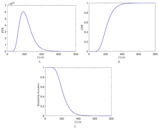 RUL prediction results for Engine 10: (A) PDF of the remaining lifetime; (B) CDF of the remaining lifetime; (C) CDF of the remaining lifetime.