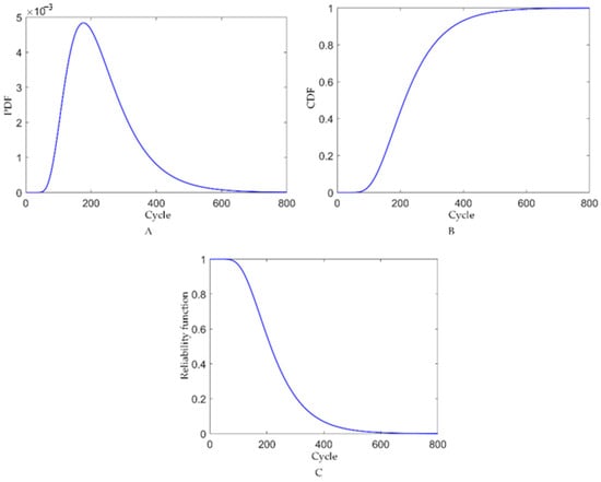 RUL prediction results for Engine 20: (A) PDF of the remaining lifetime; (B) CDF of the remaining lifetime; (C) CDF of the remaining lifetime.