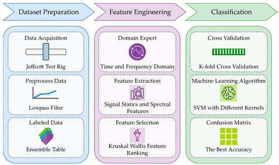 The performance of SVM is significantly influenced by the selection of hyperparameters and the method used for evaluation, just like any other ML model. One particularly important hyperparameter for SVM is the kernel function. The kernel function choice significantly impacts SVM model accuracy and generalization capabilities [9,10]. Zhang et al. conducted a comprehensive investigation of the effectiveness of polynomial, Gaussian radial basis function, and sigmoid SVM kernels in detecting unbalance faults and, remarkably, achieved 100% classification accuracy using each of these kernels [9]. In another study, Hübner et al. achieved an 84.8% accuracy in unbalance detection using a linear SVM, and 83.3% with polynomial and Gaussian radial basis function kernels [10]. It is crucial to choose the appropriate evaluation method in addition to tuning hyperparameters. In k-fold cross-validation, a technique for training and testing in ML, the choice of k significantly impacts model performance. Choosing an appropriate k value can improve accuracy. In general, the values of five (5) or ten (10) are preferred in the literature as they are believed to provide estimates of the test error rate with acceptable variance [11].