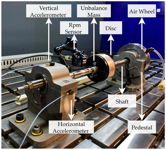 The Jeffcott rotor test rig was designed at the engine dynamics laboratory of TUSAS Engine Industries Inc. (TEI) to simulate a gas turbine rotor, particularly in terms of unbalance faults. The rotor test rig consists of an Inconel 718 shaft (TEI Alloys Inc., Eskişehir, Turkey) with a length of 455 millimetres and a diameter of 6 millimetres. The shaft is supported by two GRW6001 ball bearings (GRW Gebr. Reinfurt GmbH & Co. KG, Rimpar, Germany) mounted on relatively rigid pedestals. A plastic disc with an outer diameter of 70 mm and a thickness of 40 mm in the middle of the shaft. The disc has two holes located 10 mm from the centreline of the shaft. An unbalance mass, also known as an eccentric mass, can be attached to the disc using a bolt and nut. The 455-millimetre-long shaft is connected to adjustable compressed air through an air wheel. The motor operation is controlled by adjustable compressed air for variable or constant speed rotation of the shaft. Two PCB 352A24 accelerometers (PCB Piezotronics, Depew, NY, USA) near the bearings on the shaft support measure radial rotor vibrations in the horizontal and vertical directions. The test rig’s rotational speed is measured using a BAUMER CH-8501 laser sensor CH-8501 laser tachometer (Baumer Electric AG, Frauenfeld, Switzerland) and a shaft-mounted reflector. The main components found in the rotor test rig are shown in Figure 2.