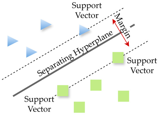 SVM, a type of supervised ML algorithm, is widely used for solving both classification and regression problems [33]. The SVM classifies data into two or more classes using hyperplanes, as presented in Figure 3. The support vectors are the data points closest to the hyperplane that separates the classes and lie along the plane’s boundaries. The SVM algorithm seeks to identify a hyperplane that most effectively distinguishes data points of one class from those of another [32]. The margin represents the maximum width of the plane parallel to the hyperplane that contains no data points. When the margin between classes is larger, the classification error tends to be lower [34]. The simplest form of SVM is the linear SVM algorithm, which can be used when the samples associated with the labels can be separated linearly. SVM algorithms can also handle non-linear classification problems through kernel tricks when the set of samples cannot be separated linearly [26].