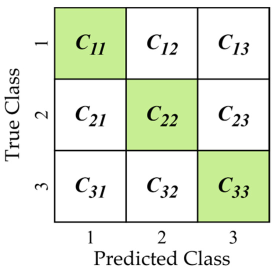 A confusion matrix is used to display the performance of a classification model. The correctly classified fault types are indicated by the diagonal entries of the matrix, while the misclassified fault types correspond to the off-diagonal entries. Various performance metrics are employed to evaluate classification algorithms, including accuracy, precision, recall, and F1 score [36]. These metrics are derived from the confusion matrix. After training and testing different classification algorithms, the model with the highest performance metrics is chosen. A typical confusion matrix for multi-class classification as in this study is shown in Figure 4, where, , and Class 1 is the normal operation without mass (Fault Code 1); Class 2 is a faulty operation with a 3.6g unbalance mass (Fault Code 2) and Class 3 is a faulty operation with a 5.2g unbalance mass (Fault Code 3), s are the Class i samples that were correctly classified, while s are the Class i samples that were incorrectly classified as Class j.
